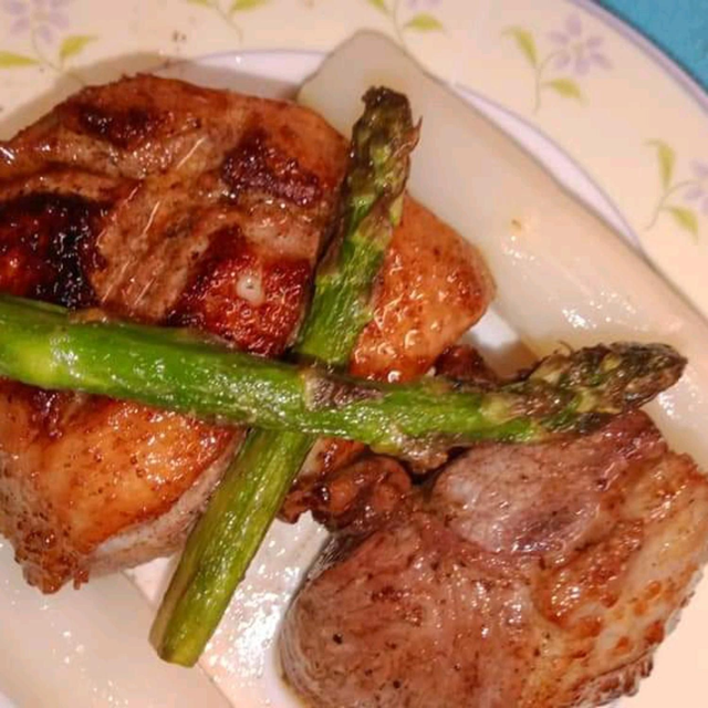 assiette de magres de canards grillée avec accompagnement de asperge verte et blanc par personne
