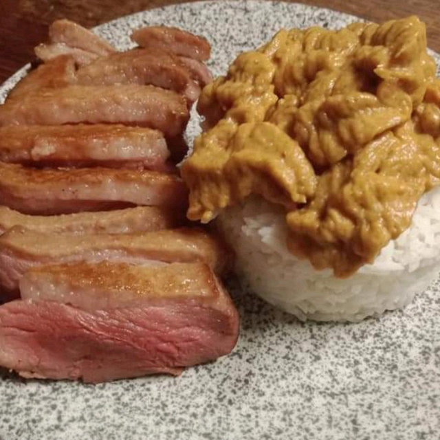 assiette de magres de canards et timbale de riz et sauce de châtaignes part personnes 35,00 Euro la barquette de 1 personnes